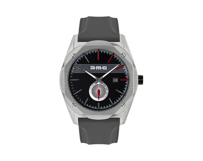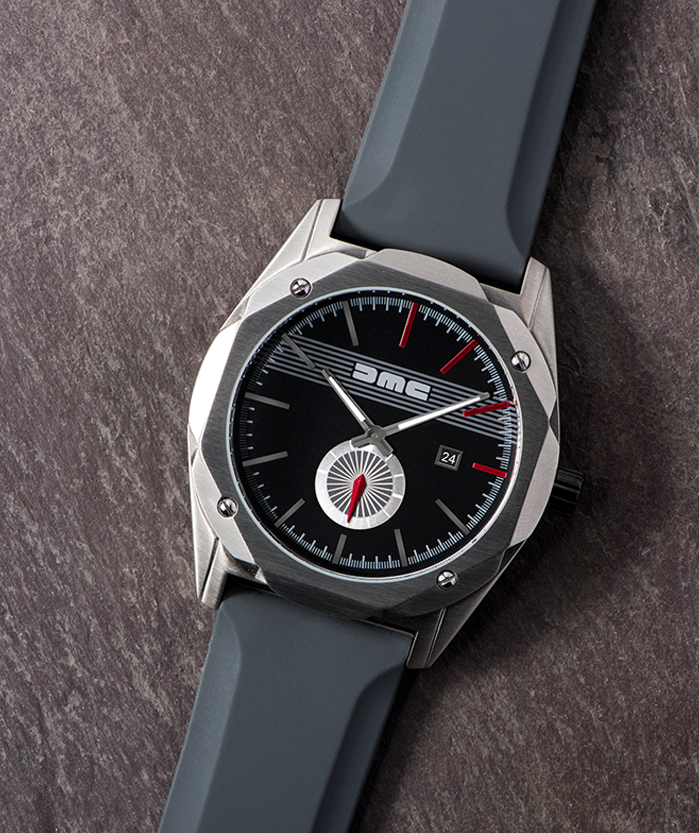 Beneath the steel caseback engraved with an image of the DeLorean car with its gullwing doors fully open, sits the reliable, durable, and precise Miyota OT45 quartz movement. Driving the center hands, running seconds subdial, and date function, this watch engine boasts a five-year battery life.